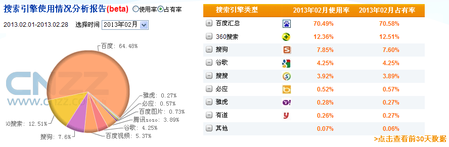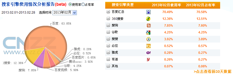什么都是虛的,只有通過一些真實(shí)數(shù)據(jù)分析得來的東西才是最站的住腳的,下面是我們通過站長(zhǎng)工具得出的2013年2月國(guó)內(nèi)各大搜索引擎服務(wù)商的使用情況報(bào)告,請(qǐng)先看使用率的數(shù)據(jù)分析: