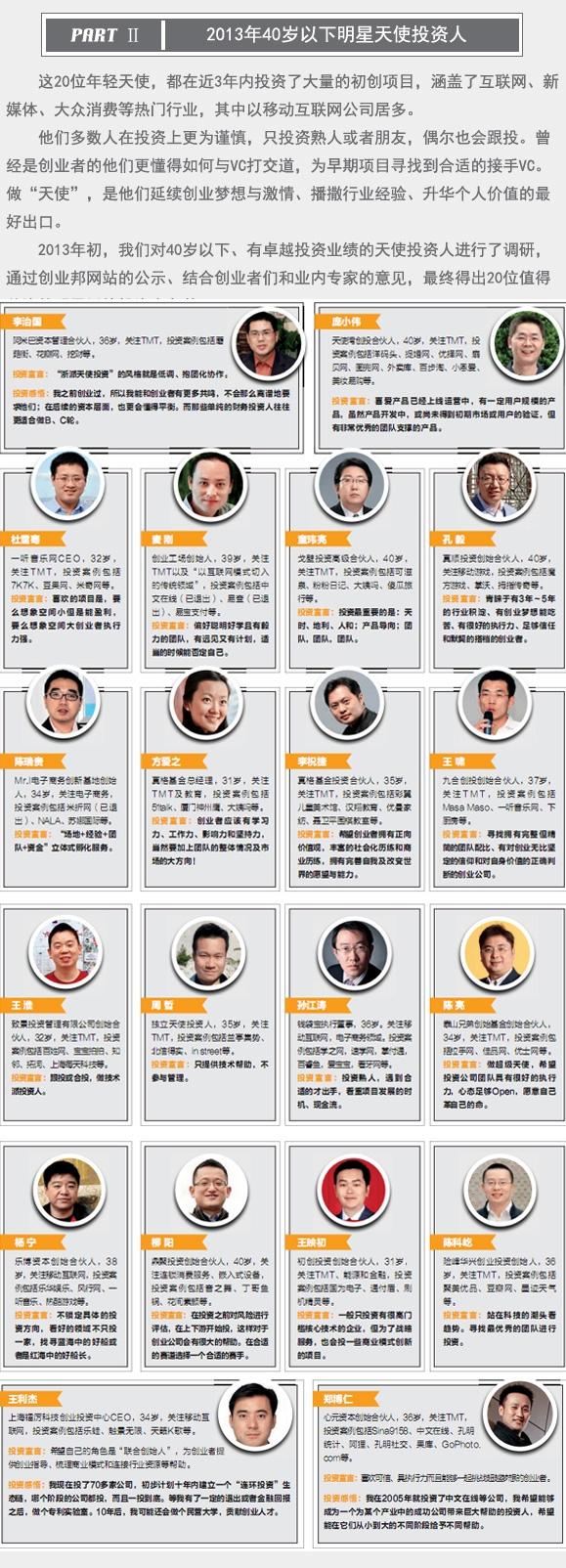 今年,《創(chuàng)業(yè)邦》雜志正式推出了“40位40歲以下明星投資人”。這個(gè)榜單分為兩部分,40 歲以下明星風(fēng)險(xiǎn)投資人和40歲以下明星天使投資人——兩者都同屬于早期投資人的行列。
